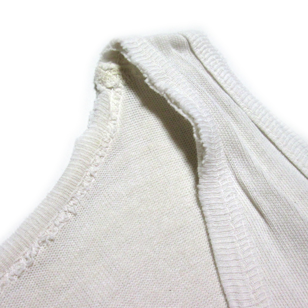 Condition | こちらの商品は、全体的にやわらかな風合いとユニークな味わいが魅力の一品です。全体に薄い黄ばみや黒ずみが見られますが、これも長年のご愛用による風合いの一部としてお楽しみいただけます。胸部には小さな穴(約2cm)がございますが、デザインの一部として個性をお楽しみいただける方におすすめです。首まわりにはほつれや破れ、しみがございますが、ヴィンテージ感や味わい深さをお求めの方にはぴったりの一品です。 ※商品の特性上、状態にご理解いただける方にご購入をおすすめいたします。 | ||