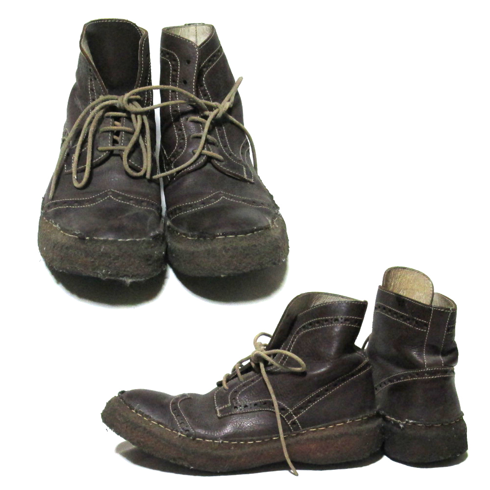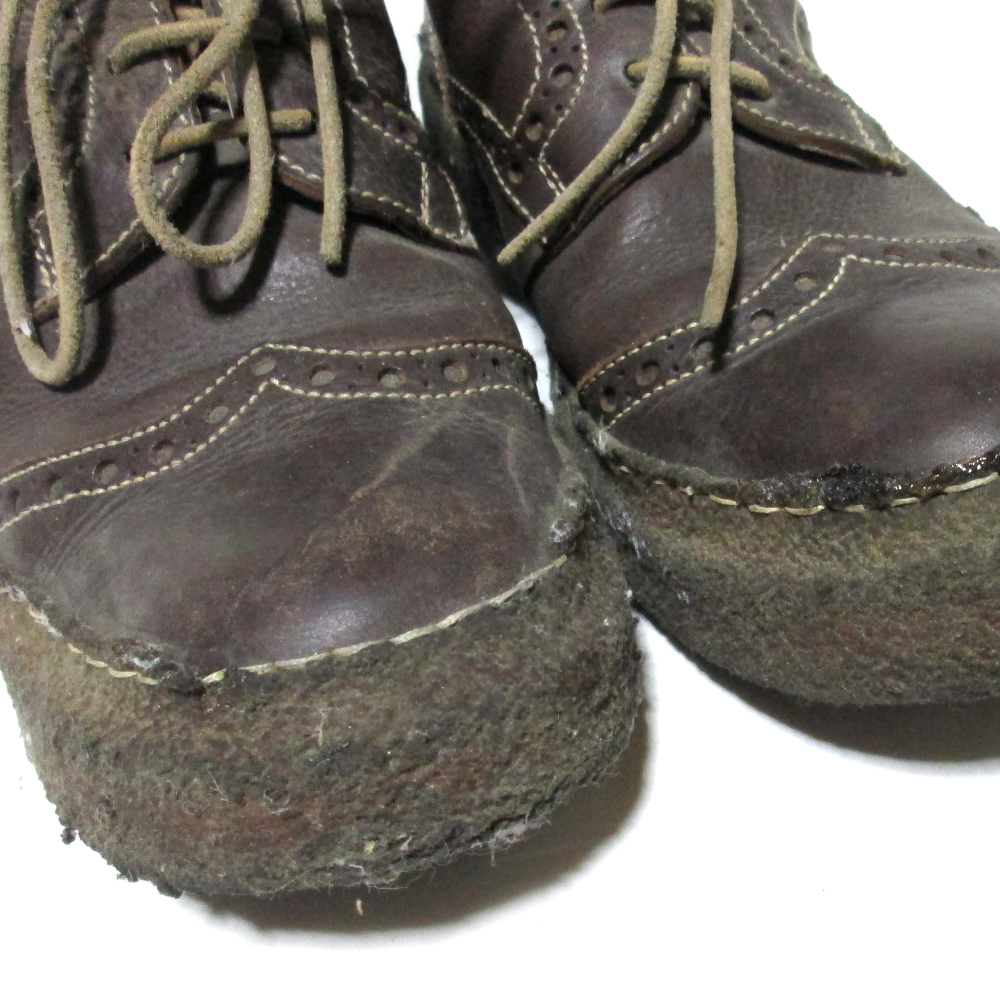 | Comment | COMME des GAR_ONS(コム デ ギャルソン) と英国シューメーカー Dry-shoD(ドライショッド) のコラボレーションによる、希少なウイングチップ厚底6ホールブーツ。ブラウンレザーにクラシックなウイングチップを施し、さらに厚底ソールを合わせたことで、無骨さとモード感が共存する一足です。存在感あるシルエットは、ギャルソンらしいスタイルのアクセントに最適。こちらはヴィンテージ品のため、革の硬化や経年劣化が見られます。その分、価格を抑えてご提供しております。状態をご理解いただける方、コレクションやディスプレイ、またリメイクベースとしてもおすすめです。【スタッフの一言】厚底仕様のDry-shoD製ギャルソンブーツは滅多に出回りません。経年はありますが、ファッション性と希少性を兼ね備えた特別な一足です。 【買い取りご案内】当店ではCOMME des GAR_ONSをはじめ、Dry-shoD製のコラボレーションブーツや厚底ヴィンテージシューズの買取も承っております。お気軽にご相談ください。 |