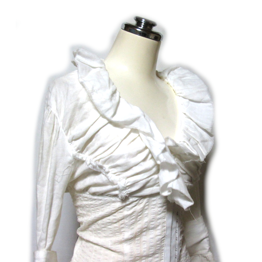 | Comment | 祈りと背徳、その境界に佇む一着。alice auaaが描く、悪魔的とも言えるゴシック美を体現したコルセットガーゼブラウスです。繊細で脆さを感じさせるガーゼ素材に、身体を締め上げるコルセット構造。相反する要素が同時に存在することで、装う人の内面までも露わにするような緊張感を纏います。背中にはレースアップを施し、細部まで計算された立体的な構造。ただ“着る”のではなく、身体を通して完成する――アリスアウアアならではの、極めて凝った作りが印象的です。甘さも救いも用意されていない、純度の高いゴシック。静かに、しかし確実に心を侵食する存在感があります。 【スタッフの一言】 これは可愛いとか格好いいでは語れません。「悪魔的」という言葉が、いちばん正確だと思います。 【買い取りご案内】 アリスアウアアをはじめ、ゴシック・アヴァンギャルド文脈のデザイナーズアイテムの買い取りを行っております。造形や世界観を重視し、丁寧に拝見いたします。お気軽にご相談ください。 |