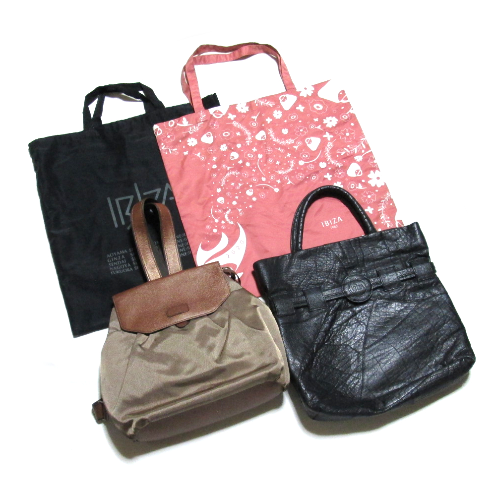 IBIZA(イビザ)らしいクラフト感あふれる、上質レザーと丁寧な縫製が魅力の4点セット。メインの黒レザーパッチワークトートバッグは、重厚感のある本革に異素材ミックスを施した人気デザイン。合わせて、レザー×ナイロンリュック(ブラウン)と、使い勝手の良いエコバッグ2点をセットにしました。いずれもコンディション良好で、日常使いにもギフトにもおすすめです。【スタッフの一言】IBIZAのクラフト感をまとめて楽しめるお得な4点セット。どのアイテムも落ち着いたカラーで、季節を問わずお使いいただけます。一点ずつの造りの良さはもちろん、セットとしての統一感も魅力です。