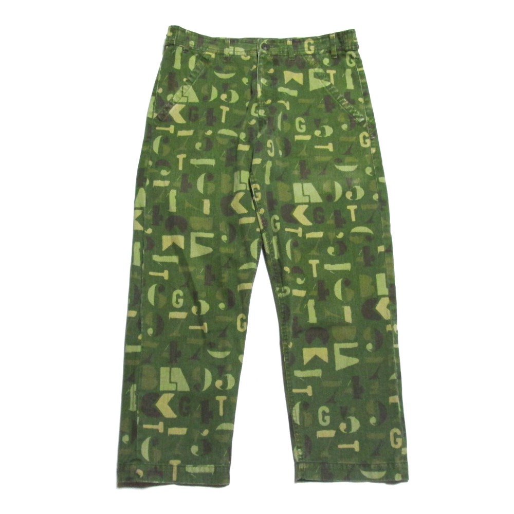 美品 BLACK COMME des GAR_ONS ブラック コムデギャルソン 「S」 日本製 英字迷彩モノグラム ワークパンツ (ユニセックス カモフラージュ グリーン) 139276